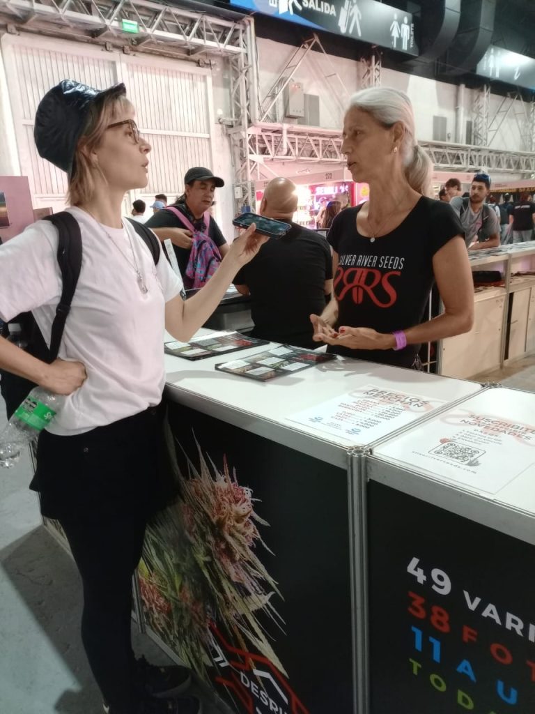 El predio cerrado de Costa Salguero era como una Sala de Escape 420, stands, pasadizos, salas, luces, en ese trajín de colores y sonidos vimos de lejos a Andrea, en el Stand de Silver River Seeds, movía las manos como explicando algo a un grupo de jóvenes. Nos acercamos al stand y vino a nuestro encuentro con una sonrisa y una complicidad como si nos conocieramos desde hace mucho tiempo. Andrea es compa de Alberto, un estudioso y apasionado de la planta, juntos montaron esta empresa argentina que se dedica hace muchos años a la producción de semillas de cannab1s.